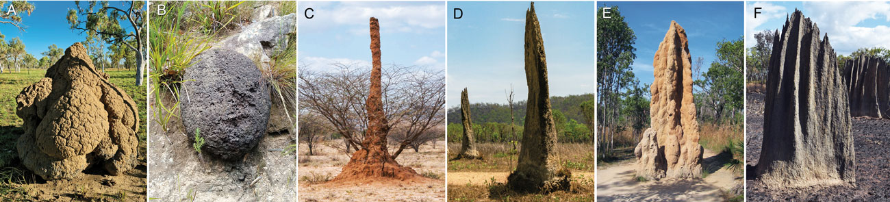 On the outside, termite mounds can be divided into two categories: large fortresses that can be many meters tall, or small configurations that measure a few centimeters high (see figure above). Soil composition influences mound structure, so the final type of mound depends on the type of soil available locally.