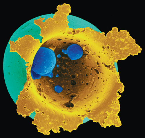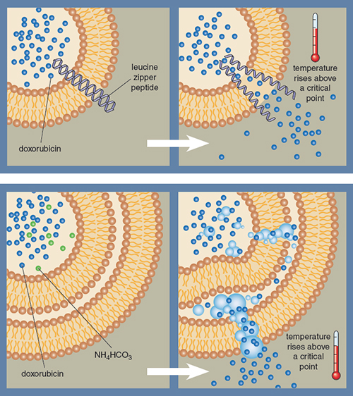 Perhaps the most unexpected mechanism for opening a liposome at the right critical temperature is the use of bubbles. This innovative approach relies on creating permeable defects in the lipid bilayer with carbon dioxide bubbles. The carbon dioxide is generated (along with water and ammonia) as a result of the decomposition of ammonium bicarbonate—more commonly known as baking ammonia—at about 42 degrees C. (This is, in fact, the same principle used to leaven bread and cakes.) In this type of liposome delivery system, the gas bubbles created inside the membrane build up pressure and distort the arrangement of the membrane bilayers. As the carbon dioxide bubbles permeate the lipid bilayer, the compartmentalized drug is quickly released. The bubbles not only create the necessary defects in the lipid bilayer, enabling the drug to escape, they also help yield clearer results in ultrasound-guided tissue imaging.