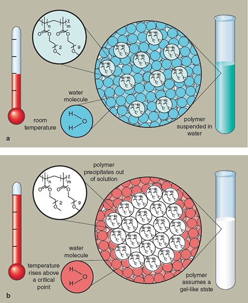 With their unprecedented ability to alter their physical properties in response to temperature changes, thermo-responsive polymers make good building blocks for intelligent drug delivery systems, either on their own or in combination with other materials. Medical scientists, biotechnologists, and pharmaceutical researchers have been quick to seize the opportunity. A growing number of polymer-based drug delivery systems are already under development. In some cases, a particular polymer is engineered to serve a specific purpose. ReGel® is a broadly used delivery platform made by Allergan and marketed in two formulations: OncoGel® when coupled with chemotherapeutic agent paclitaxel for esophageal cancer, and Cytoryn™ when coupled with interleukin-2 (IL-2) for cancer immunotherapy. In similar fashion, Timoptic-XE® (Merck & Co.) is used for slow-release delivery of the drug timolol to treat hypertension within the eye.