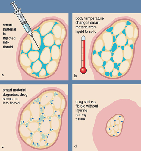 Using polymers to deliver a therapeutic agent directly into uterine fibroids is a novel approach that has the potential to reduce systemic side effects considerably. As an additional advantage, administering a drug directly to the fibroid can be used to deliver small peptides that would be degraded in the gastrointestinal tract if the drug were taken orally. Treating fibroids by means of a local injection—a procedure that can be accomplished in a doctor’s office—could significantly improve the feasibility of helping women who want to maintain fertility while seeking relief from troubling uterine symptoms. Moreover, by slowing the diffusion of the drug away from the injected fibroid, prolonging the release of the drug and delaying its inactivation, polymer-based treatments should reduce the need for repeated injections.