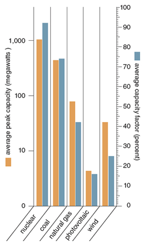 Unit sizes of new converters will not make the transition any easier. Ratings of 500–800 megawatts (MW) are the norm for coal-fired turbogenerators and large gas turbines have capacities of 200–300 MW, whereas typical ratings of large wind turbines are two orders of magnitude smaller, between 2 and 4 MW, and the world’s largest PV plant needed more than a million panels for its 80 MW of peak capacity. Moreover, differences in capacity factors will always remain large. In 2009 the load factor averaged 74 percent for U.S. coal-fired stations and the nuclear ones reached 92 percent, whereas wind turbines managed only about 25 percent—and in the European Union their mean load factor was less than 21 percent between 2003 and 2007, while the largest PV plant in sunny Spain has an annual capacity factor of only 16 percent.