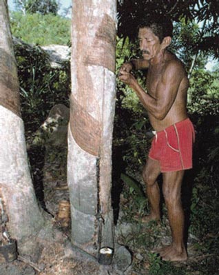 Above, an Amazonian rubber tapper scores a tree’s bark to extract latex.—R.R.