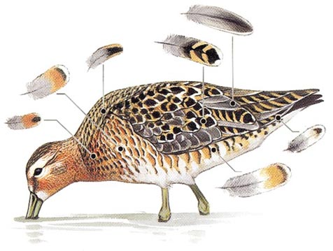 There is a method to birding, and Sibley offers practical tips on how to become a master. He starts with how one should approach the subject: where to look, how to move, how to listen, what to draw and what to look for in the bird’s behavior. Along the way he offers simple insights that will help beginners, and even some intermediate birders. A typical example: If the situation permits, look first at a bird’s bill and face. Related species typically have similar bills (for example, flycatchers tend to have broad, flat bills), whereas the face and bill together are uniquely marked in many species (but not in flycatchers!). Birders of all levels will enjoy several chapters on feathers, wings and molting near the end of the book, including a section on how the different types of feathers combine to create an overall color pattern on a bird, as the drawing of a short-billed dowitcher illustrates.