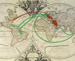 But if the first group of igneous rocks is made from the ancient West African basement, what is the source for the second group of rocks? A clue to this mystery came from the specific age of the rock—between 750 million and 1.1 billion years old, according to the Sm-Nd data. This interval corresponds to an important event in world geography. About 1.0 billion to 1.1 billion years ago, the collision of many continents led to widespread mountain building and the eventual formation of the supercontinent Rodinia, so named after the Russian word for "homeland." Furthermore, the widespread development of continental shelves and new, mantle-derived magmas about 750 million years ago is thought to reflect the breakup of this supercontinent.
