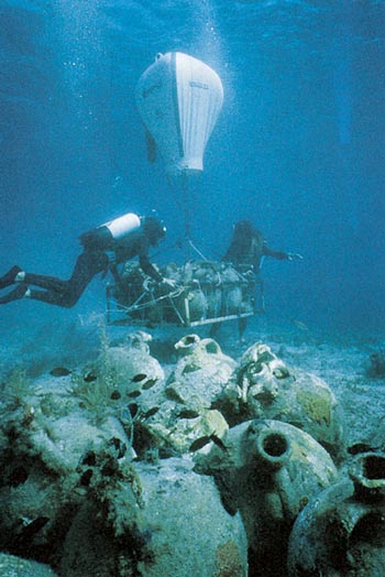 A reef off Yassiada, a small Aegean island near Turkey, has sent more than a dozen ships to their doom. This curse for mariners has been a blessing for undersea archaeologists. Three of the wreck sites have been excavated, including this, the first of the bunch discovered, that of a 7th-century Byzantine ship. Here, divers send amphoras surface-ward, using a balloon as dumbwaiter.